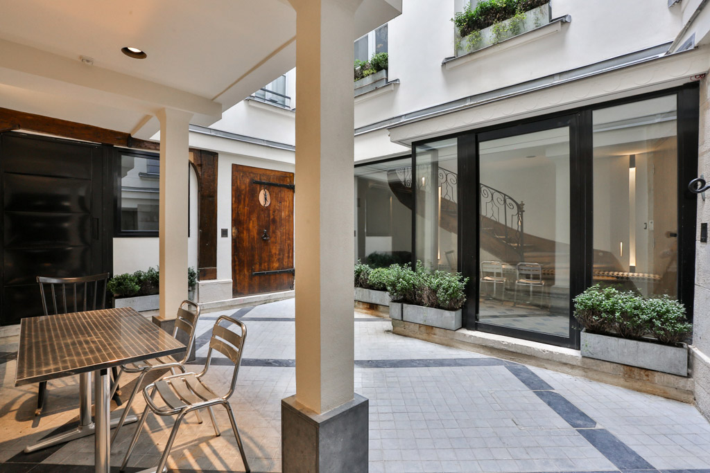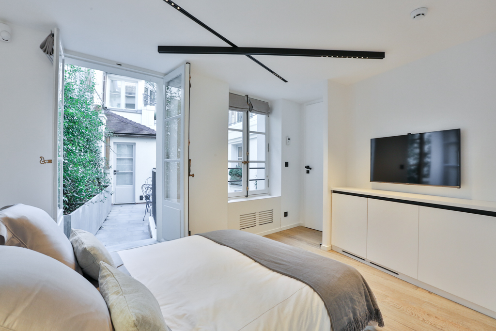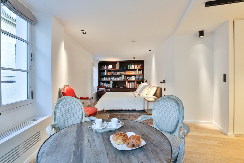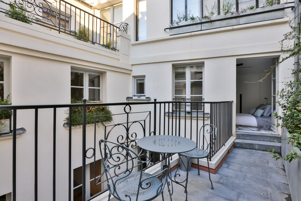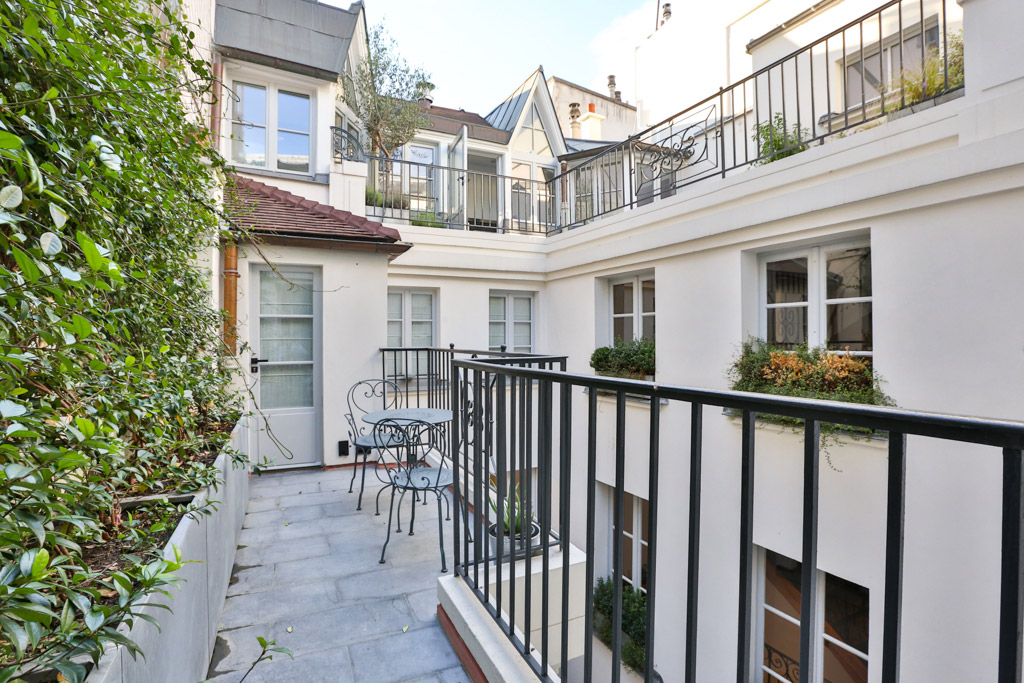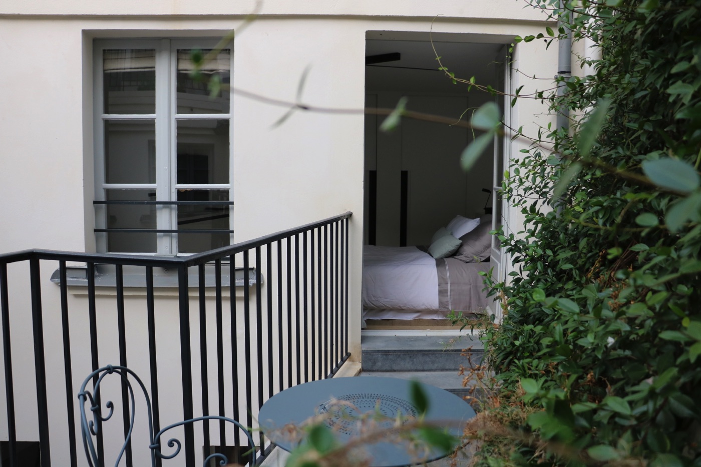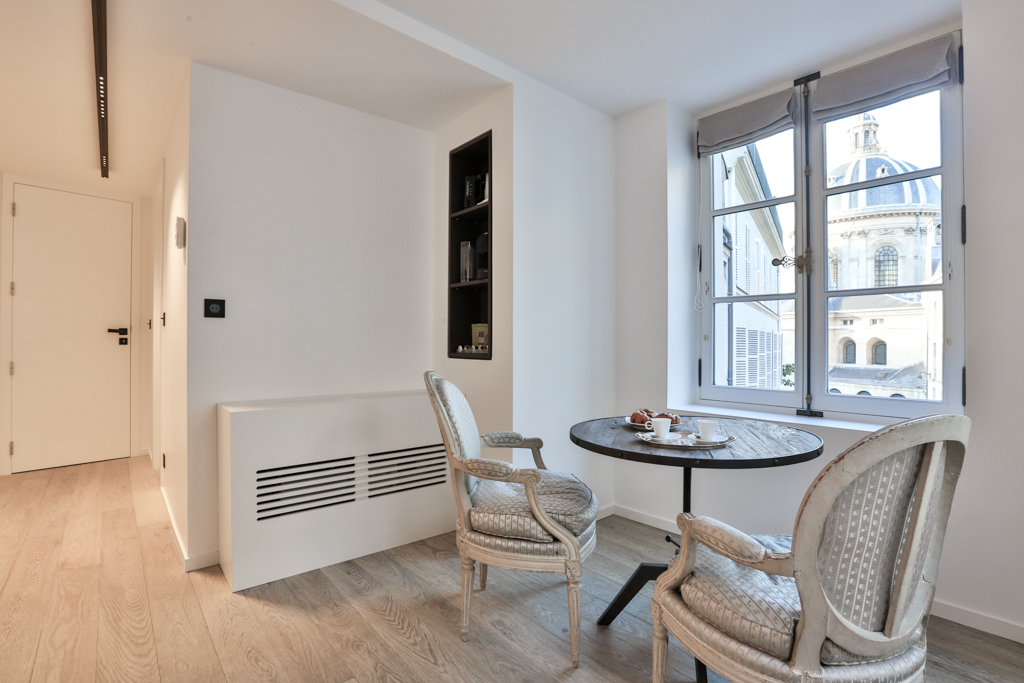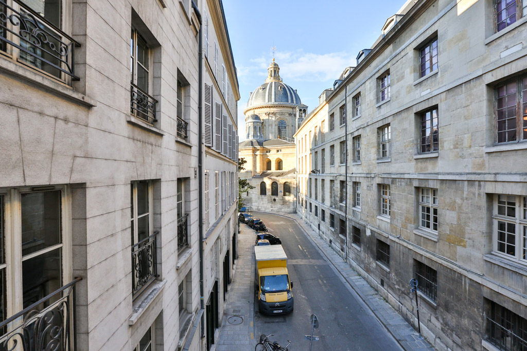 Votre logement spacieux et lumineux est doté d'une terrasse privative fleurie, telle un jardin suspendu au milieu des toits de Paris, donnant sur le patio privatif de la demeure et vous offrant ainsi une parfaite intimité. Les hautes fenêtres des chambres vous permettent d'admirer la vue unique sur le splendide dôme de l'Institut de France, à seulement quelques mètres.